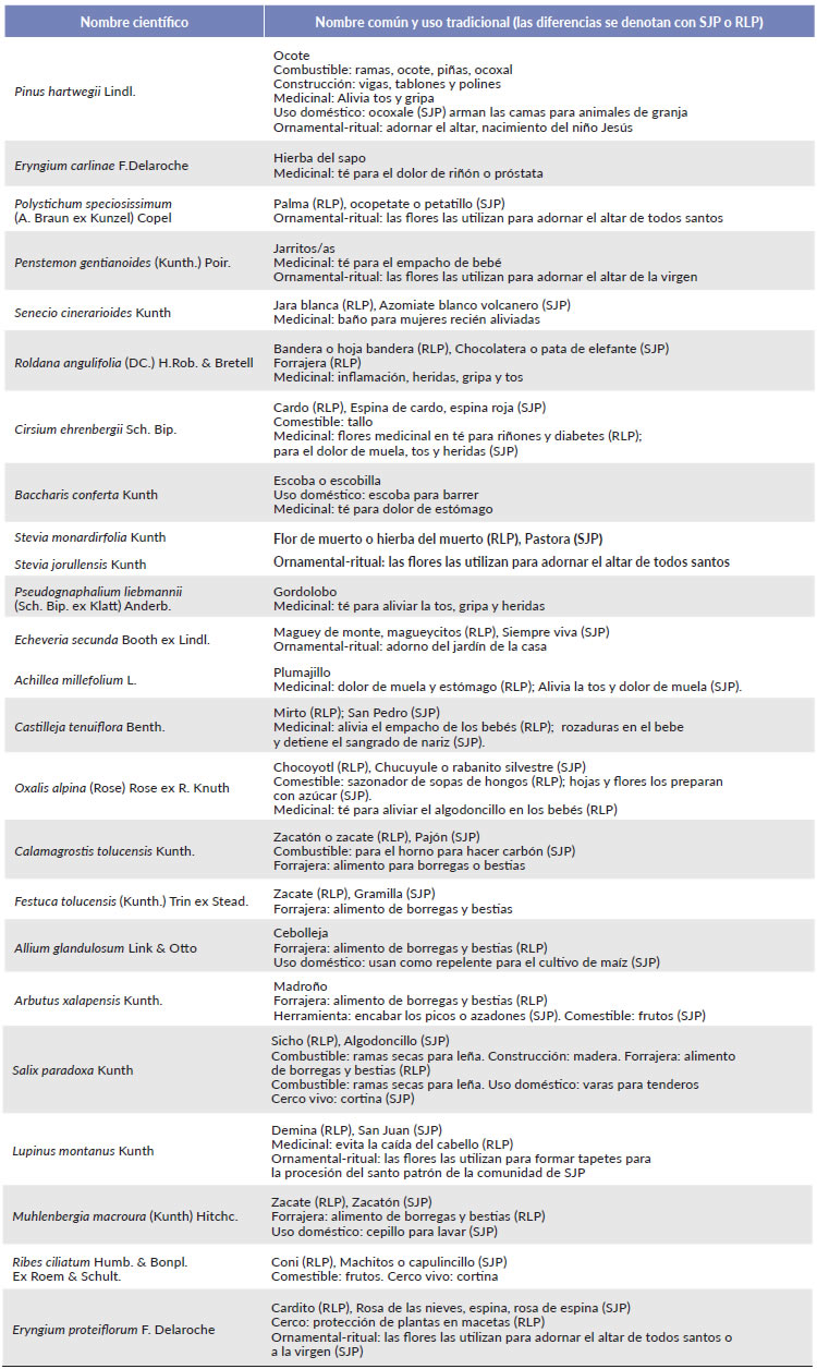 También se encontraron cuatro especies en SJP que los habitantes no utilizan, pero reconocen con nombres comunes como: Pixtle (Holodiscus orizabae Ley), Cuane-neque o Sobrepalo (Arceuthobium globosum Hawsksw. & Wiens), Gallitos (Funkiella hyemalis A. Rich. & GaleottiJ y Cilantrillo (Bidens triplinervia Kunth).