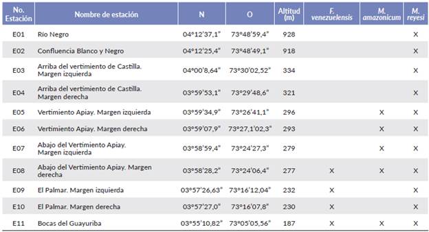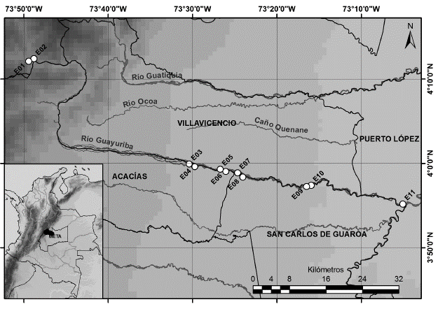 El río Guayuriba se ubica en la subregión biogeográfica del piedemonte Andino en el flanco oriental de la cordillera Oriental de Colombia (MADS et al. 2012) (Fig. 1). Posee un área de 760 km2 que ocupa parte de los departamentos de Cundinamarca y Meta, por lo que constituye una de las principales fuentes hídricas de los municipios aledaños (Torres-Mora et al. 2015). Nace en la unión de los ríos Blanco y Negro (985 m de altitud) y desemboca en el río Metica (192 m de altitud) (Ajiaco-Martínez et al. 2015, Torres-Mora et al. 2015). Enero, febrero y marzo registran las mayores temperaturas medias mensuales (25 °C), mientras que junio y julio los valores más bajos (22,6 °C); los meses más secos son enero (58 mm) y febrero (100 mm) mientras que mayo (526 mm) y junio (506 mm) son los más húmedos (CORMACARENA y ISD 2010). Para obtener el material biológico se realizaron muestreos en once estaciones a lo largo del río durante el año 2014 (Tabla 1, Fig. 1), principalmente en el periodo de aguas descendentes (noviembre-diciembre), y ocasionalmente en otros periodos del ciclo anual.