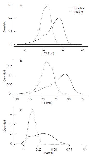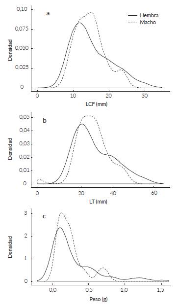 Figura 2: Diagramas de densidad de distribución de la frecuencia de a. longitud del cefalotórax (LCF, mm); b. longitud total (LT, mm) y c. Peso (g) de acuerdo con el sexo en M. reyesi.