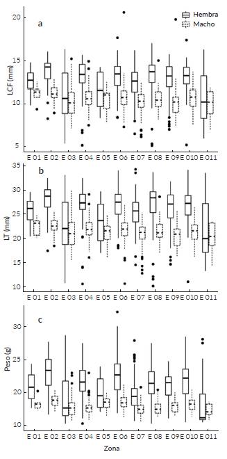 a. Longitud del cefalotórax (LCF, mm); b. Longitud total (LT, mm) y c. Peso (g).