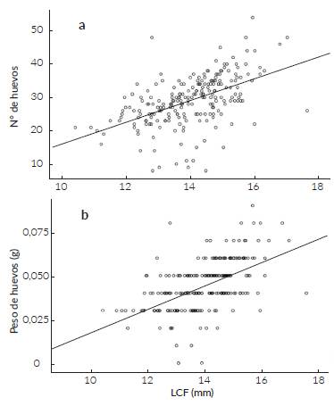 En el periodo de aguas descendentes (septiembre-noviembre) se registró un gran número de hembras de M. reyesi ovadas (n = 223). Los promedios de LCF, LT y P fueron mayores para hembras ovadas en comparación con las no ovadas, y se evidencia que las hembras alcanzan la madurez sexual al llegar a una longitud mínima total de 22 mm (Tabla 4, Fig. 5). Igualmente, se registró una variación grande entre el número (8-54, media = 29,13) y peso (0,01-0,09, media = 0,044 g) de los huevos. Lo anterior posiblemente se deba a que el tamaño de las hembras (LCF) mostró una relación positiva con el número (Spearman; P<< 0,01, R 2 = 0,57) y peso (Spearman; P << 0,01, R 2 = 0,56) de los huevos (Fig. 6), lo que sugiere que a medida que las hembras adquieren mayor tamaño su fertilidad también aumenta.