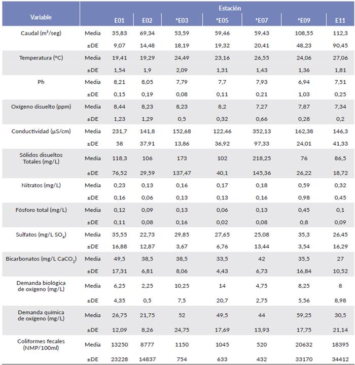 La conductividad y la temperatura aumentaron a medida que se desciende a los tramos más bajos del río Guayuriba; el pH y el oxígeno disuelto no mostraron mayor variación en las diferentes estaciones, mientras que los nitratos y el fósforo total mostraron valores altos (0,59 y 0,45, respectivamente) en E09-E010. Los STD mostraron una alta variación a lo largo de las estaciones, mientras que los valores de CF fueron altos en los primeros y últimos tramos del río (Tabla 2).