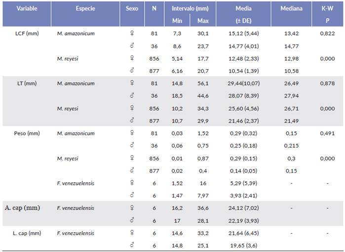 Para describir el comportamiento de las variables LCF, LT y P, entre machos y hembras en las diferentes estaciones de muestreo, se realizaron diagramas de densidad Kernel para M. reyesi y M. amazonicum. Se compararon los promedios de LCF, LT y P, entre machos y hembras, mediante la prueba de Kruskal-Wallis, dado que los datos no cumplieron el supuesto de homocedasticidad. Igualmente, se compararon los promedios de LCF, LT y P entre hembras ovadas y no ovadas de M. reyesi mediante la prueba de Kruskal-Wallis. Y para determinar si existían relaciones entre el número de huevos y P, y LCF de hembras de M. reyesi, se empleó el coeficiente de correlación de Spearman. Todos los análisis se llevaron a cabo con el software RStudio (Rstudio Team c2016).