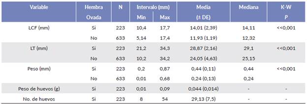 Tabla 4: Tamaño del intervalo, media y mediana de las variables LCF, LT y peso, y prueba de Kruskal-Wallis de determinación de diferencias de los promedios de estas variables entre hembras ovadas y no ovadas de M. reyesi registradas en el río Guayuriba.
