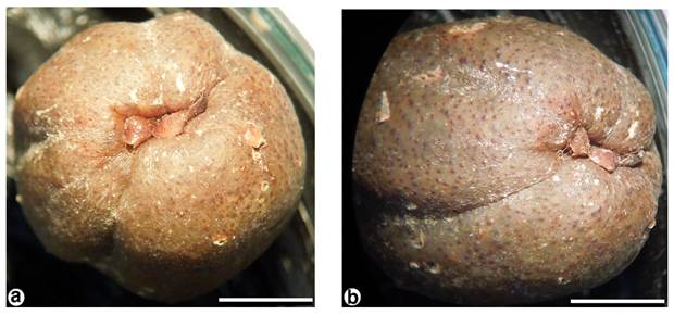 Figura 2: Parte apical del fruto de Myrcia diaz-piedrahitae. a. Porciones de la parte apical, delimitadas por la extensión de los surcos longitudinales, con formas y tamaños diferentes, b. Remanentes del cáliz desplazados hacia adentro del ápice del fruto. a-b de Patiño et al. PFS069 (PSO). Escala: 5 mm.