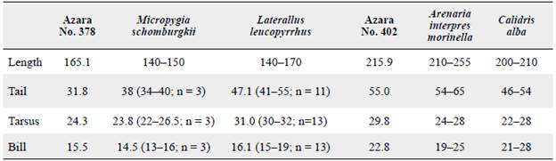 Table 1: Comparative measurements for Azara's 378, 402 and species suggested in the literature. For the measurements provided by Azara one inch is treated as equivalent to 25.4 mm and one line ("una línea") is treated as equivalent to 2.21 mm consistent with conventions of the time (Smith et al. 2018). Crake measurements from Taylor and van Perlo (1998) mean followed by range and number of specimens. Wader measurements from Hayman et al. (1991), range only, no mean or number of specimens provided.