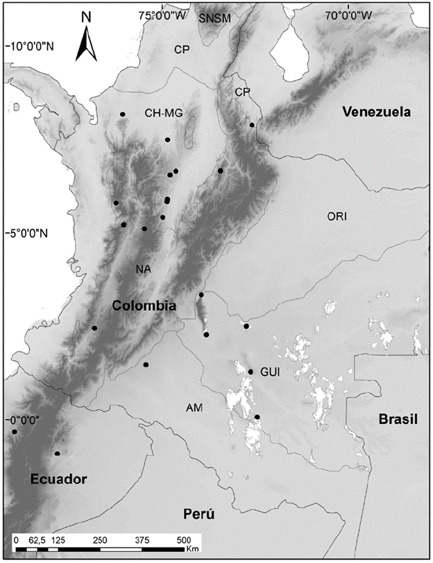Figura 1: Distribución de Lonchorhina aurita y delimitación de provincias biogeográficas según Hernández-Camacho et al. (1992); SNSM = Sierra Nevada de Santa Marta; CP = Cinturón árido pericaribeño; CH-MG = Chocó-Magdalena; NA = Andes del Norte; ORI = Llanos del Orinoco; GUI = Guayana; AM = Amazonía. Manchas en blanco representan la distribución de los inselbergs en la Orinoquía. Puntos negros representan las localidades de los especímenes revisados.
