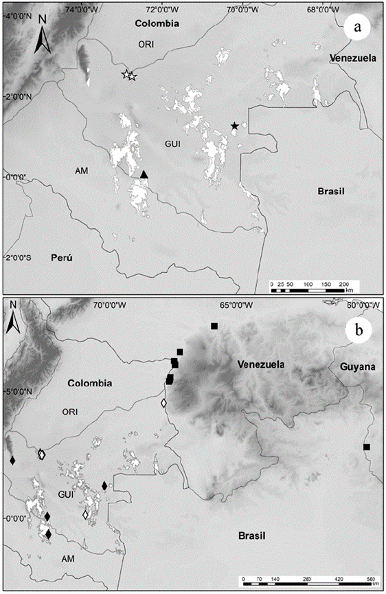 Lonchorhina orinocensis; ORI = Llanos del Orinoco; GUI = Guayana; AM = Amazonía. Manchas en blanco representan la distribución de los inselbergs en la Orinoquía. Estrellas = localidades de L. marinkellei. Triángulo = localidad tipo de L. mankomara. Cuadrados= Localidades de L. orinocensis fuera de Colombia, Rombos = Localidades de L. orinocensis de Colombia. Símbolos negros: localidades extraídas de literatura. Símbolos blancos nuevas localidades de L. marinkellei y L. orinocensis.