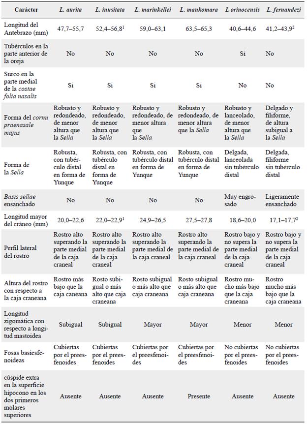 Tabla 1: Algunos caracteres externos y craneales útiles para diferenciar las especies descritas de Lonchorhina.