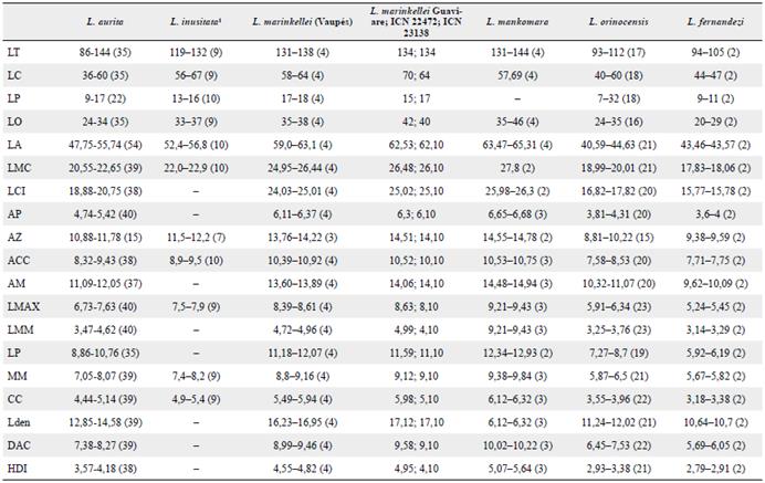 Presentamos dos nuevas localidades del murciélago endémico de Colombia L. marinkellei para la Serranía de La Lindosa en el departamento de Guaviare en la provincia biogeográfica de la Guayana (Fig. 2a). Estos registros están basados en una hembra inactiva capturada 500 m antes de la cascada Las Delicias en la vereda El Retiro (ICN 22472; 02° 30' Norte, 72° 44' Oeste), y un macho con testículos en posición abdominal sobre el Raudal de Angosturas II en la vereda El Raudal del Guayabero en el municipio de San José del Guaviare, departamento de Guaviare (ICN 23138; 02° 34' Norte, 72° 52' Oeste). Esta última localidad extiende la distribución de la especie 340 km al occidente de la localidad tipo en Mitú, Urania (Vaupés; Fig. 2a). Los especímenes concuerdan con los caracteres externos y craneales propios de L. marinkellei (Tabla 1; Fig. 3). Las medidas craneales de L. marinkellei son menores a las reportadas para L. mankomara y mayores a las reportadas para las demás especies del género (Tabla 2). La distribución de L. marinkellei queda ahora restringida a dos Inselbergs: Mitú, Durania (Vaupés) y La Lindosa (Guaviare). Por otro lado, Lonchorhina mankomara es solo conocida de la serie tipo en Caquetá, Rio Mesay, Puerto Abeja, SE Serrania de Chiribiquete (Fig 2a). Para L. orinocensis reportamos tres nuevas localidades, La Serranía de la Lindosa en el departamento de Guaviare (ICN 22308, ICN 22336, ICN 22351 ICN 22352, ICN 22358, ICN 22459, ICN 22533, ICN 22568 ICN 22569, ICN 22591, ICN 22599; ICN 22308; 02° 30' Norte, 72° 44' Oeste; Apéndice 1), El Cerro del Mono en la confluencia del río Orinoco con el caño Matavén en el municipio de Cumaribo en el departamento de Vichada (ICN 23144, ICN 23145; 04° 32' Norte 67° 51' Oeste), y El Cerro Morroco en el departamento de Vaupés (ICN temporal D3M 785, 790, 781; 00° 08' Norte, 70° 56' Oeste; Fig. 2b). Los registros se basan en 17 individuos que presentaron los caracteres propios de la especie (Tabla 1). Las medidas craneales de L. orinocensis son mayores a L. fernandezi con excepción de AP, AZ, LMM, y son menores a las reportadas para para las demás especies del género (Tabla 2). La especie se distribuye ahora en toda la franja de la Guayana desde La Serranía de La Macarena en la porción más occidental de la región hasta el cerro Kusad Mountain en Guyana según el registro de un especimen depositado en la colección del Royal Ontario Museum (ROM 122490; Lim et al. 2016) y presentado en Lim et al. (2016) como el primer registro confirmado de la especie para Guyana (Fig. 2b). En Colombia la especie está presente en siete inselbergs: La Lindosa en el departamento de Guaviare, Cerro del Mono en el departamento de Vichada, Mitú, Urania (= Durania) y Cerro Morroco en el departamento de Vaupés, Caserío Araracuara en el departamento de Amazonas, Río Mesay en el departamento de Caquetá y Caño Cristales en el departamento de Meta (Fig. 2b).
