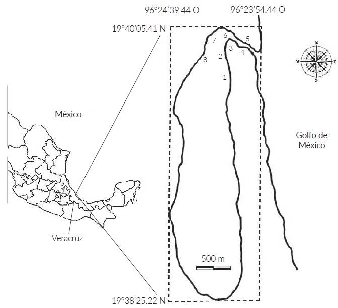 El estuario Laguna El Llano (ELEL) se localiza entre 19°38' Norte a 19°40' Norte, y 96°23' Oeste a 96°24' Oeste, en el municipio de Actopan, Veracruz (Fig. 1). Es un cuerpo de agua de 226 ha, la profundidad en los márgenes internos es menor a 1 m, pero en el canal central alcanza un intervalo estacional de profundidad de 2 a 4 m.