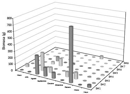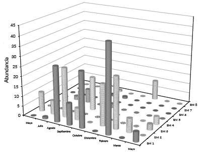 En SM 1-4 con vegetación de manglar y fondos lodosos se recolectó el 91,3 % de la abundancia total y 93,2 % de la biomasa total en contraste con SM 5-8, cercanas a la boca de comunicación que presentaban aguas claras, fondos arenosos y sin vegetación de manglar (Figs. 2 y 3).