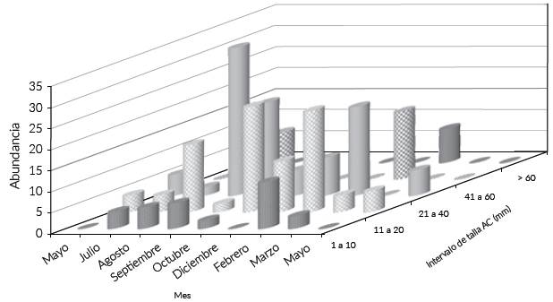 Las medidas de AC de los machos se registraron en un intervalo de 12 a 92 mm, en las hembras el intervalo fue de 9,0-92,08 mm; respecto al P de los machos, el intervalo fue de 0,3-156,2 g y el de las hembras de 0,7-152,6 g; se definieron cinco clases de talla, las más abundantes fueron las de 11-20 mm y 41-60 mm AC, estas dos clases sumaron el 76,44 % de la abundancia y fueron más numerosas en los meses de agosto de 2013 y febrero de 2014, solo estuvieron ausentes en diciembre de 2013 y mayo de 2014 (Fig. 4); en marzo de 2014 se colectó un único individuo en proceso de muda. Se observó una diferencia entre las composiciones de tallas mensuales (KW, H = 15,53 P < 0,05). La abundancia de C. sapidus no se correlacionó con las variaciones de las variables hidrológicas (P > 0,05).
