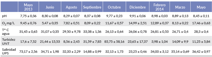 Con base en la tendencia mensual de los parámetros hidrológicos (Tabla 1), se identificaron cuatro etapas: la primera caracteriza el final de la temporada de boca estua-rina cerrada en mayo 2013, el aislamiento provocado por la presencia de la barra arenosa más la ausencia flujos de agua dulce y el inicio de la temporada cálida explican el aumento de la salinidad hasta 76 UPS, las aguas estuvieron bien oxigenadas y la turbidez se mantuvo en niveles bajos y el pH fue ligeramente alcalino.