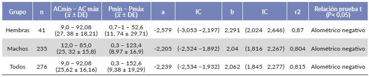 Para probar la hipótesis de crecimiento isométrico se usó una prueba de t student Ho: b = 3 contra H1: b # 3 con n-1 grados de libertad y un nivel de significancia de P = 0,05. De la misma manera, para determinar si ocurrieron diferencias entre los valores de b de machos y hembras se probó Ho: bmachos - bhembras = 0, lo que indica diferencias entre las pendientes, contra H1: bmachos - bhembras # 0, que indica diferencias en el valor de b entre los grupos; además se usó una prueba de ANCOVA para comparar las diferencias entre las relaciones biométricas de AC vs P entre sexos.