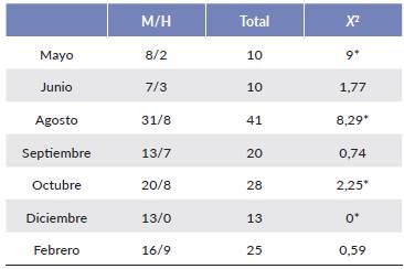 y valor de P. M = machos, H = hembras, * = diferencias estadísticas respecto a la proporción sexual machos/hembras 1:1 (P < 0,05).