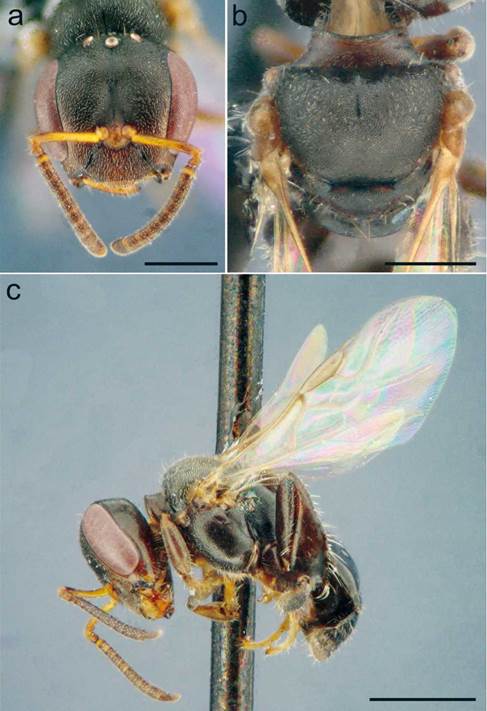 Figura 1: Obrera de Trigonisca sachamiski sp. nov. a. cabeza en vista frontal; b. mesosoma en vista dorsal; c. vista lateral. Escalas: a y b = 0,5 mm; c = 1 mm.