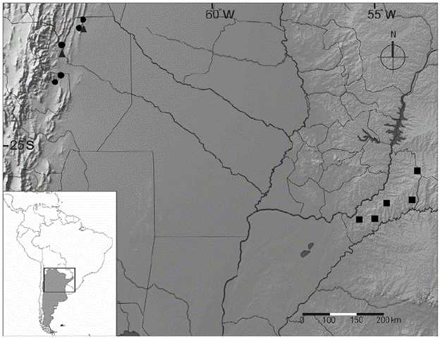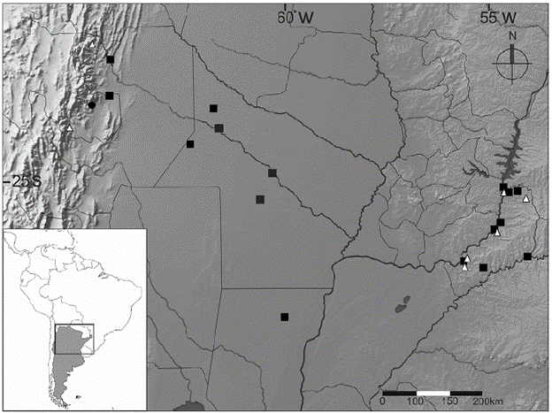 Figura 2: Mapa de distribución de Trigonisca sachamiski sp. nov. y de las especies del género Nannotrigona presentes en la Argentina. Círculo = Trigonisca sachamiski sp. nov.; Triángulo = Nannotrigona melanocera; Cuadrado = N. testaceicornis.