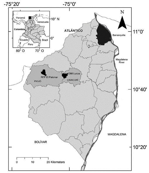 The study was conducted in two of the three protected areas in Atlántico: Distrito Regional de Manejo Integrado (DMI) Luriza and Reserva Forestal Protectora (RFP) El Palomar. The DMI Luriza (Fig. 1) has an area of 339 hectares and is located in the municipality of Usiacurí, at 10°45' North and 75°01' West, with an elevation of 100-200 m. The region corresponds to the upper basin of the Luriza river, part of the Canal del Dique sub-area in the Magdalena-Cauca hydrographic area (Alexander et al. 2009, Molina-Acosta 2013). The average temperature is 27.5 °C and annual rainfall is 980 mm. The reserve is composed of dry forest (19 %), sclerophyllous vegetation (54 %), pastures (25 %) and open woodland (2 %; Rodríguez and Banda-R 2011). The best preserved areas of DTF are located along the low terrains of the Luriza basin; other areas are covered with successional intermediate forest, with low to medium levels of intervention. Most of the study area is surrounded by subsistence crops. Some species of mammals are present, including the howler monkey, Alouatta seniculus (Linnaeus, 1758) (Rodríguez et al. 2012).