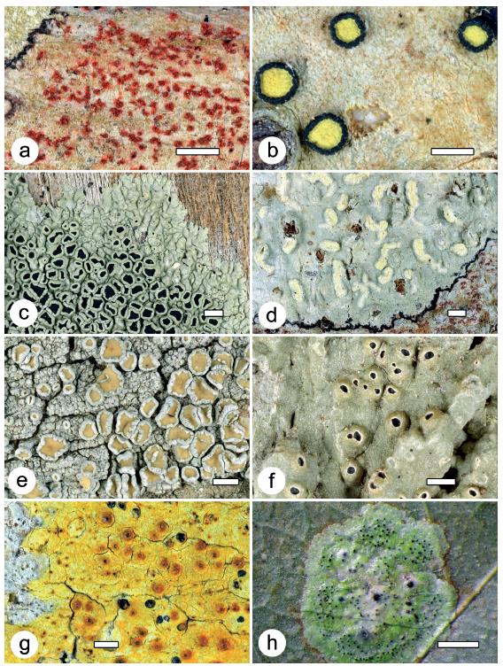 Strigula smaragdula (42990). Thalli with ascomata, in h also with pycnidia. Scale = 1 mm.