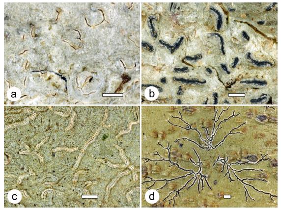 Phaeographis galeanoae (42981, holotype). Thalli with ascomata. Scale = 1 mm.