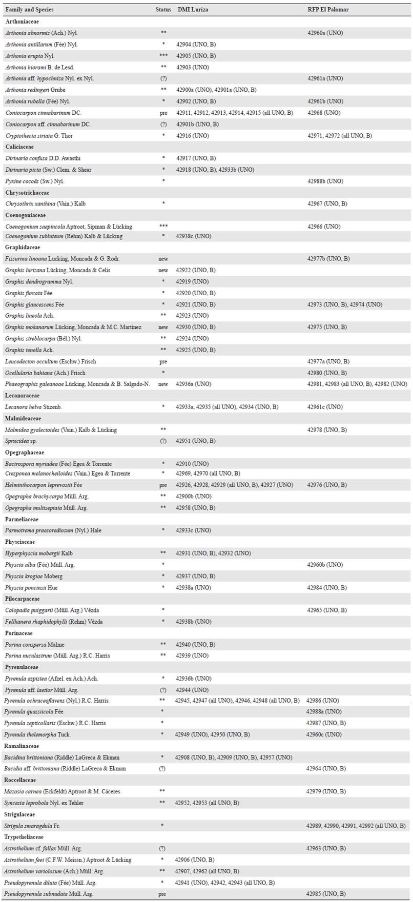 Table 1: List of 61 lichenized taxa recorded at DMI Luriza and RFP El Palomar , arranged alphabetically by family , genus, and species. Species new to science are marked as “new”, species new to the Neotropics with three asterisks, those new to Colombia with two, and those new to Atlántico with one asterisk; those known previously from Atlántico are indicated with “pre”. Voucher numbers and herbarium acronyms are indicated.