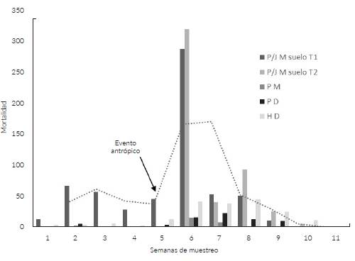 Figura 1: Mortandad a 10 largo de las semanas de muestreo, comenzando desde el 02 a 07 de agosto, H = huevos, Ρ = pichones, J = juveniles, M = muertos, D = desaparecidos, Τ = transectos 1 y 2.