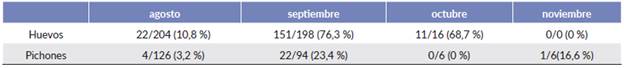 La densidad total para la colonia fue de 0,83 ind/m2. En agosto, de los 73 nidos monitoreados en el islote 1, registramos cuatro pichones muertos y cinco pichones desaparecidos. Desde la primera semana de muestreo, registramos algunos individuos muertos en el suelo o en la superficie del agua (Fig. 1). A partir de la segunda semana de muestreo y durante todo agosto, la cantidad de pichones y juveniles hallados muertos en islote 1 rondaba los 50 por semana para 207 en total, pero en la primera semana de septiembre, la mortandad se incrementó notablemente a más de 250 individuos, para luego descender en las semanas posteriores. El 5 de septiembre, registramos la mortandad en el islote 2, hallando 320 pichones y 212 juveniles muertos, reduciéndose también esa mortandad en las semanas siguientes. Cabe aclarar que no existían datos de este transecto anteriores al 5 de septiembre. En septiembre, durante los recorridos de T1 y T2 registramos un total de 883 individuos muertos. Del mismo modo, para los nidos monitoreados, las muertes fueron superiores en septiembre (Tabla 1).