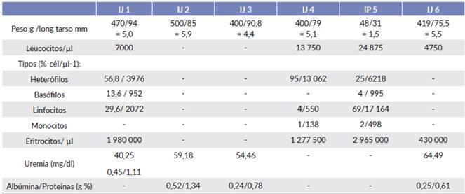 El hallazgo más consistente fue una condición corporal muy pobre, evidenciada por escasa masa muscular de los pectorales lo que determinaba quillas prominentes y ausencia de tejido adiposo. Las vesículas biliares estaban distendidas, lo cual es signo de ayuno, y el tracto gastrointestinal no tenía material sólido, con predominancia de contenido biliar definible como un líquido verde oscuro. Esto determinaba heces diarreicas color verdoso. Los estómagos muscular y glandular tenían muy poco contenido, principalmente consistente en restos de artrópodos, vegetales y presencia de nematodos, particularmente en todos los juveniles. La intensidad de parasitismo fue de leve a moderada, según pudo establecerse mediante el conteo de adultos de parásitos, utilizando las categorías designadas por Sychra et al. (2008) para las tasas de infestación en piojos. En todos los juveniles se detectaron piojos masticadores, en cargas bajas (menos de diez piojos por individuo). Mostraron anemia aquellos individuos para los que hubo muestra suficiente para realizar estudios hematológicos (Tabla 2). En comparación con valores de referencias (Celdrán et al. 1994, Polo et al. 1994), los niveles de urea en sangre fueron elevados, lo que puede indicar deshidratación. Asimismo, los niveles de albúmina y proteínas séricas totales fueron muy bajos, lo que es evidencia de nutrición deficiente; otros parámetros no mostraron desviaciones significativas de los patrones normales (Celdrán et al. 1994, Polo et al. 1994) (Tabla 2).