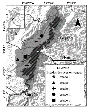 El estudio se realizó en el sur del departamento del Huila, Colombia, en el área de compensación ambiental y restauración ecológica de la Central Hidroeléctrica el Quimbo, que comprende 11 079 hectáreas ubicadas entre los municipios de El Agrado, Gigante, Garzón y Paicol (Fig.1). El área se sitúa entre los 720 y 1400 m de altitud, presenta una temperatura media anual de 25 o C y dos temporadas de lluvias en el año, una en los meses de octubre-noviembre y la otra en marzo-abril y una temporada seca muy marcada entre junio y agosto. Las precipitaciones anuales oscilan entre los 800 y 1400 mm (IDEAM, estación 21045010 Betulia) y el ecosistema corresponde a la zona de vida de bosque seco tropical (bs-T) (Holdridge 1967), inmerso en un mosaico de coberturas vegetales en diferentes estadios de sucesión secundaria (García et al. 2014).