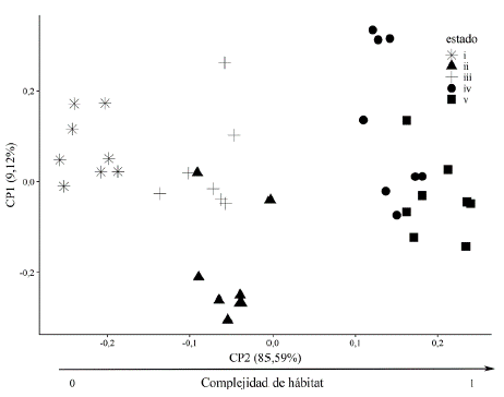 Figura 2: Análisis de componentes principales (ACP) de la complejidad estructural del hábitat (CH) en los diferentes estados sucesionales evaluados; se aprecia el gradiente de complejidad de hábitat de izquierda a derecha a partir el componente principal 1 (CP1) que explica el 85,59 % de la variabilidad.