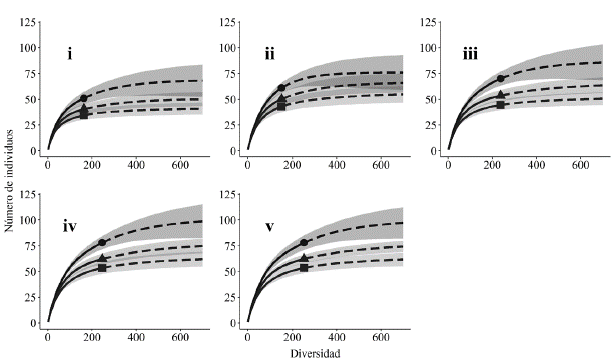 Figura 3: Curvas de rarefacción basadas en el número de individuos para cada estado de sucesión evaluado en el bosque seco tropical (bs-T) del sur del valle del Magdalena. La parte punteada de cada curva representa la extrapolación (diversidad esperada) con el estimador Chao1 y la parte continua la interpolación (diversidad observada). Círculos representan el número de Hill del orden q0, los triángulos del orden q1 y los cuadrados del orden q2. Las áreas sombreadas representan intervalos al 95 % basados en remuestreos de bootstrap. Los estados sucesionales se indican con números romanos i a v.