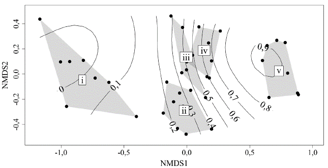Figura 4: Análisis de escalamiento métrico (NMDS) basado en distancia de similitud de Bray-Curtis, los ejes representan distancias arbitrarias con el fin de evaluar el solapamiento y diferencias de las comunidades de aves. Cada punto corresponde a sitios de muestreo en cada estado de sucesión y las curvas son una superficie ajustada representando la complejidad de hábitat que aumenta de izquierda a derecha (0 a 1). Los estados sucesionales están rodeados por un polígono mínimo convexo y se indican con números romanos i a v.