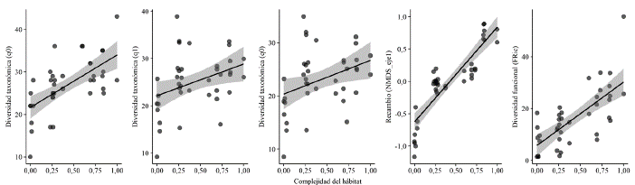 Figura 5: Relación entre la diversidad taxonómica y funcional de la avifauna con la complejidad de hábitat a nivel de toda la comunidad. Las áreas sombreadas corresponden al intervalo de confianza al 95 %.