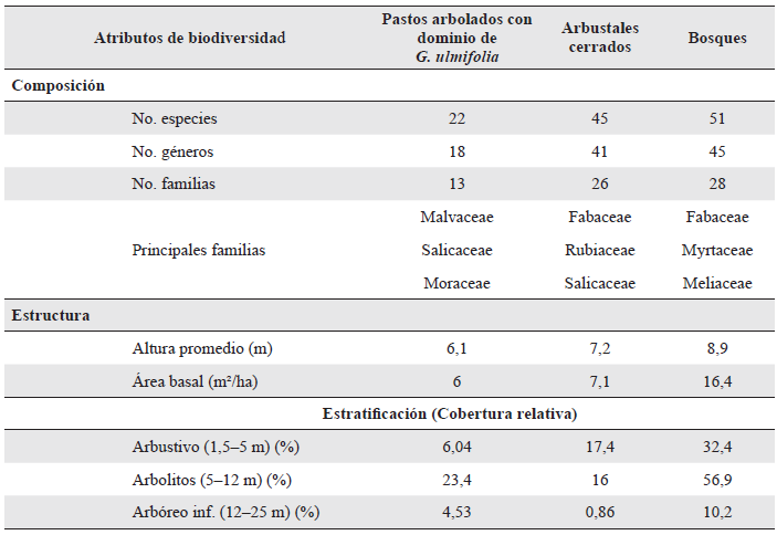 Los arbustos caducifolios adquisitivos (TFP 4) fueron los más abundantes en los pastos arbolados con dominio de G. ulmifolia. Este patrón podría obedecer a una mayor capacidad de adaptación a condiciones que exigen alta eficiencia hídrica, expresada en rasgos que contribuyen a tolerar o evadir la sequía (Aranda et al. 2014), en este caso la presencia de hojas caducifolias (Salgado-Negret y Paz 2016) o a una menor área foliar, lo que contribuye a disminuir la respiración y la pérdida de agua (Kucharik et al. 1998). Por lo tanto, es posible inferir que el principal filtro ambiental que configura la composición de rasgos en la comunidad es la disponibilidad de agua (Ceccon y Hernández 2009), seguido por el tipo de perturbaciones antropogénicas (Foley et al. 2005) debido a que el área de estudio estuvo sometida a una ganadería tradicional extensiva (Avella et al. datos no publ.) en la que era frecuente dejar algunos árboles de G. ulmifolia para favorecer el sombrío y forrajeo del ganado.