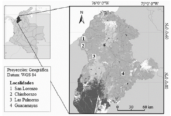 Figura 1: Localización geográfica de los fragmentos de bs-T evaluados en las fincas Las Palmeras-Montería (8°30'37"N - 76°06'13"W); San Lorenzo-Los Córdoba (8°53'20"N - 76°18'43"W); Guacamayas-Buenavista (8°11'05"N - 75°31'49"W); y Chimborazo-Canalete (8°44'32"N -76°19'23"W) en Córdoba-Colombia.
