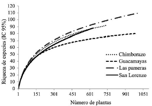 Figura 2: Curvas de acumulación de especies de plantas vasculares en los cuatro fragmentos de bs-T inmersos en matrices de ganadería extensiva en Córdoba, Colombia.