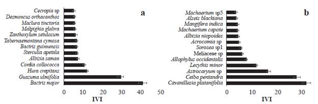 Figura 4: Índice de valor de importancia (IVI) por especies vegetales (DAP >1 cm, cuatro parcelas de 0,1 ha) en fragmentos de bs-T en matrices de ganadería extensiva con, a. sistema silvopastoril y b. sistema convencional.