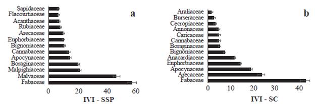 El índice de valor de importancia por especie (IVI) de plantas en los fragmentos del SSP fue mayor para Bactris major (40,8), Guazuma ulmifolia (29,4), Hura crepitans (11,9) y Cordia collococca (10,4), especies que presentan un IVI mayor que los reportados por Olacuaga et al. (2016) en áreas de bs-T en otras áreas de la Región Caribe. En los fragmentos del SC las especies Cavanillesia platanifolia (Humb. & Bonpl.) Kunth (31,9), Ceiba pentandra (L) Gaertn. (28), Astrocaryum sp. (16,5) y Lecithys minor Jacq. (11,7) tuvieron el mayor IVI (Fig. 4). El índice de valor de importancia para las familias (IVIF) en los fragmentos del SSP fue mayor para Fabaceae (57,6), Malvaceae (46,5), Malpighiaceae (20.8) y Boraginaceae (20,4); mientras que, en los fragmentos del SC, Fabaceae (42.9) , Arecaceae (23,8), Apocynaceae (18,8) y Euphorbiaceae (14,2) presentaron mayor IVIF (Fig. 5). Estos resultados son concordantes con los reportes de familias de plantas para ecosistemas secos tropicales (Gentry 1995, Mendoza-C. 1999, Albesiano y Rangel-Ch 2006, Carrillo-Fajardo et al. 2007, Carbonó-Delahoz y García-Q. 2010, Rodríguez M. et al. 2012, Berdugo-Lattke y Rangel-Ch 2015, Villanueva et al. 2015, Dryflor et al. 2016, Sanmartín-Sierra et al. 2016, Olascuaga-Vargas et al. 2016, Herazo Vitola et al. 2017).