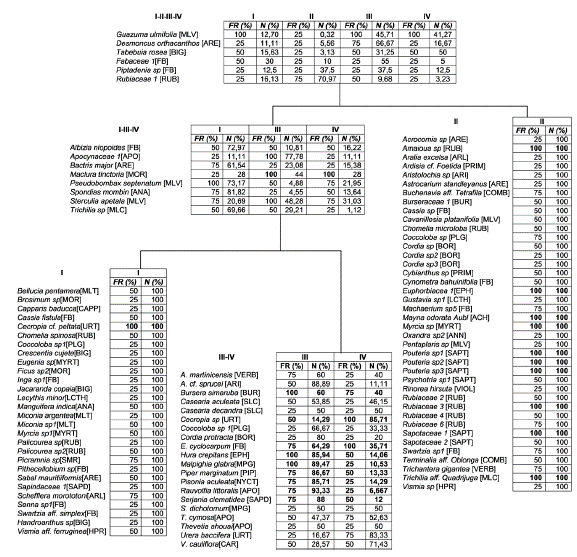 Figura 6: Análisis inverso de Kaandorp de los ensamblajes plantas vasculares en los fragmentos de bs-T Guacamayas (I), Chimborazo (II), Palmeras (III) y San Lorenzo (IV), Porcentaje del promedio de abundancia total (% N) y porcentaje de la frecuencia por ensamblaje (% Fre). Achariaceae (ACH), Acanthaceae (AC), Anacardiaceae (ANA), Annonaceae (ANN), Apocynaceae (APO), Araceae (ARA), Araliaceae (ARL), Arecaceae (ARE), Aristolochiaceae (ARI), Asteraceae (AST), Bignoniaceae (BIG), Boraginaceae(BORA), Burseraceae (BUR), Cannabaceae (CANN), Capparaceae (CAPP), Caricaceae (CAR), Cochiospermaceae (CCHL), Combretaceae (COMB), Connaraceae (CNN), Costaceae (CST), Cyclanthaceae (CYCLAN), Dilleniaceae (DLL), Euphorbiaceae (EPH), Fabaceae (FB), Flacourtiaceae (FLAC), Heliconiaceae (HCL), Hypericaceae (HPR), Lamiaceae (LMC), Lauraceae (LRC), Lecythidaceae (LCTH), Logoniaceae (LOG), Malpighiaceae (MPG), Malvaceae (MLV), Melastomataceae (MLT), Meliaceae (MLC), Moraceae (MOR), Myrsinaceae (MRS), Myrtaceae (MYRT), Nyctaginaceae (NYCT), Passifloraceae (PSS), Piperaceae (PIP), Polygonaceae (PLG), Primulaceae (PRIM), Rhamnaceae (RHN), Rubiaceae (RUB), Rutaceae (RUT), Sapindaceae (SAPD), Sapotaceae (SAPT), Simaroubaceae (SMR), Smilacaceae (SMLC), Solanaceae (SOL), Urticaceae (URT), Vervenaceae (VERV), Violaceae (VIOL), Vitaceae (VIT).