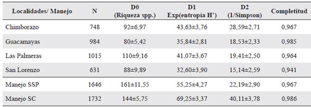 La diversidad alfa verdadera (°D), fue significativamente mayor en los fragmentos del SSP con un nivel de completitud > 97 %, con una riqueza de 17 especies efectivas más que en los fragmentos del SC (Tabla 1).