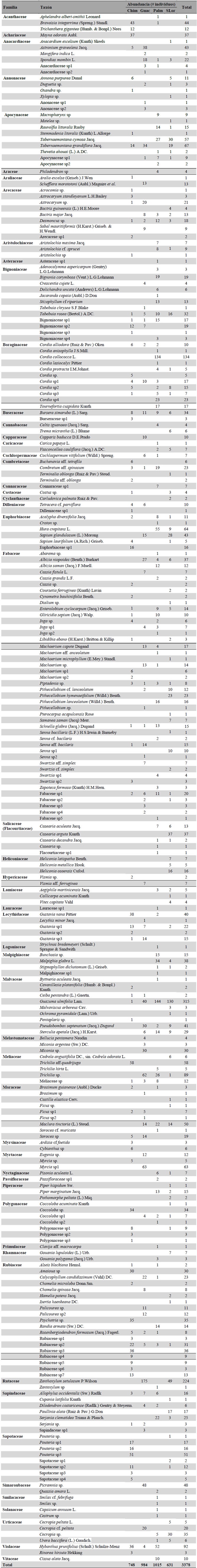Se registró un total de 3378 individuos, con un esfuerzo de muestreo que alcanzó cerca del 84 % estimado (Fig. 2). Se identificaron 252 taxones de plantas de 173 géneros y 55 familias. Las familias que presentaron la mayor riqueza taxonómica fueron Fabaceae (45), Rubiaceae (19), Bignoniaceae (12), Boraginaceae (12) y Moraceae (10). En términos de abundancia relativa fueron dominantes Malvaceae (11,66 %), Fabaceae (9,14 %), Rubiaceae (7,46 %), Boraginaceae (6,98 %) y Rutaceae (6,66 %). El género Cordia presentó mayor diversidad de taxones (10), seguido de Machaerium (6), Senna (5), Pithecellobium (4) y Casearia (4). El 73 % de los géneros estuvo representado por un taxon, 14 % por dos taxones y 8,5 % por tres taxones. Cerca del 60 % del total de los taxones registrados presentaron abundancias menores a cuatro individuos. En los fragmentos de bs-T del SSP, las familias Fabaceae, Boraginaceae y Apocynaceae presentaron mayor riqueza taxonómica; en tanto que, en fragmentos del SC Fabaceae y Rubiaceae presentaron mayor riqueza. Estos resultados concuerdan con estudios realizados en otras áreas de bs-T (Gentry 1995, IAvH 1998, Mendoza-C. 1999, Carrillo-Fajardo et al. 2007, Carbonó-Delahoz y García-Q. 2010, Coelho et al. 2012, Rodríguez M. et al. 2012, Olascuaga-Vargas et al. 2016), donde estas familias muestran una alta consistencia taxonómica, con una composición vegetal característica de este tipo de ecosistemas en el Neotrópico y en Colombia.