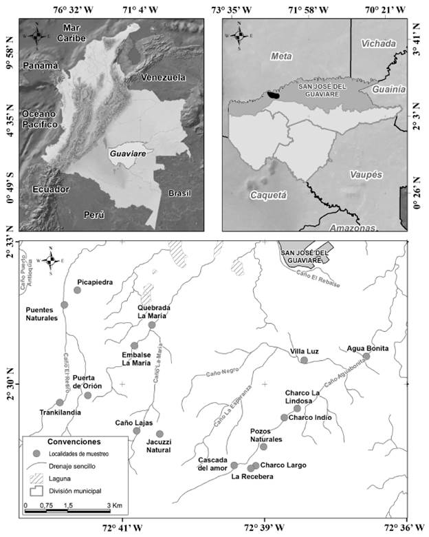 El área de estudio hace parte de las microcuencas de los caños Agua Bonita, La Lindosa y La María, las cuales pertenecen a las veredas Agua Bonita y El Retiro, en el sector nororiental de la serranía de La Lindosa. Se muestrearon los cuerpos de agua lóticos y lénticos de 16 localidades (Fig. 1). Dichas localidades corresponden a los sitios más frecuentemente visitados por la comunidad guaviarense y los turistas, por lo tanto, constituyen las áreas más vulnerables dentro de la serranía dada la intensa actividad humana. De ahí la importancia de evaluar la riqueza de macrófitas del sector, con el fin de obtener información preliminar que pueda servir para el monitoreo y futuras estrategias de conservación del área.