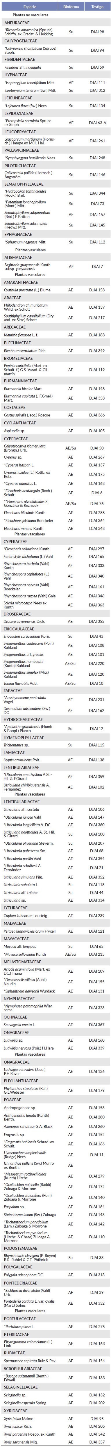 La forma de vida arraigada emergente fue la más abundante con 82 especies, le siguieron las plantas sumergidas con 20 y por último las arraigadas flotantes con tres (Tabla 1). Además, seis especies manifestaron ecofases pudiendo encontrarse sumergidas al interior de los cuerpos de agua o emergentes en las orillas: Calyptrocarya glomerulata, Eleocharis alveolatoides, Eriocaulon spruceanum, Syngonanthus humboldtii, Tonina fluviatilis y Mayaca sellowiana.
