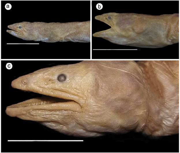 Figura 1: Especímenes de Pythonichthys asodes depositados en la Colección Ictiológica de Referencia de la Universidad del Valle (CIRUV-89015 (2), 80121 (2) y 81136). a. LT = 365, b. LT = 299 y c. LT = 567 mm. Escala = 2cm.
