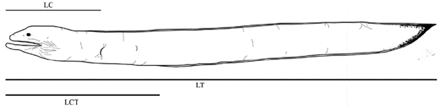 Figura 2: Esquema de Pythonichthys asodes y especificaciones de medidas base para hallar proporciones y porcentajes. LC: longitud de la cabeza, LT: longitud total y LCT: longitud cabeza+tronco