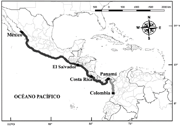 Figura 3: Distribución actualizada de Pythonichthys asodes. En gris oscuro se muestra la distribución actualmente conocida y en gris claro la extensión de ámbito después de este reporte. Los círculos representan las localidades donde la especie ha sido previamente capturada y el cuadrado constituye la localidad del nuevo registro.