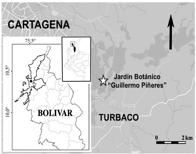 El jardín botánico "Guillermo Piñeres" está ubicado en área rural de Turbaco, en el sector Matute, departamento de Bolívar - Colombia (10°21' Norte, 75°25' Oeste) a 134 m de altitud (Fig. 1). Hace parte del zonobioma Cinturón Árido Pericaribeño, el cual presenta un régimen pluviométrico cuasi-bimodal, con un período seco definido entre diciembre y marzo, un período lluvioso entre agosto y noviembre con las mayores precipitaciones en el mes de octubre, y un periodo de transición entre abril y julio; la temporada de baja precipitación en los meses de junio y julio es llamada comúnmente Veranillo de San Juan (Jaramillo-Robledo y Chaves-Córdoba 2000, Pabón et al. 2001). El jardín fue creado en 1978 para el estudio y conservación de la flora y fauna de la región Caribe Colombiana, abarcando nueve hectáreas, cinco de ellas con colecciones de plantas y cuatro con bs-T nativo protegido. El área de bosque presenta la mayor parte de su cobertura original y otra parte como formación secundaria, con algunos elementos de Bosque Húmedo Tropical, Bosque Tropical Semicaducifolio, Bosque de Galería y Bosque Ripario, debido a la presencia de cuerpos de agua permanentes. Entre las especies vegetales dominantes se encuentran: Cavanillesia platanifolia (Humb. & Bonpl.) Kunth (macondo), Bursera simaruba (L.) Sarg. 1890 (indio en cuero), Astrocaryum malybo H.Karst. (palma espinosa), Swietenia macrophylla King (caoba), Cedrela odorata L. (cedro), Anacardium excelsum L. (caracolí), Ficus maxima Mill. (higuerón), Aspidosperma desmanthum Benth. ex Müll. Arg. (carreto), Cecropia peltata Linnaeus, 1759 (yarumo) y Nectandra turbacensis Nees (laurel amarillo) y a nivel faunístico los componentes más comunes son: Alouatta seniculus (Linnaeus, 1766) (monos aulladores), Bradypus variegatus Schinz, 1825 (perezoso), Dasyprocta punctata (Gray, 1842) (agouti americano), Tayassu tajacu (Linnaeus, 1758) (pecari), Sciurus granatensis Humboldt, 1811 (ardilla roja), además de varias especies de aves, reptiles y anfibios.