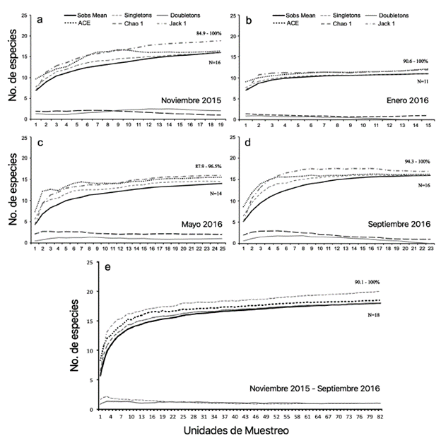 Los estimadores de ACE, Chao 1 y Jack-Knife 1 mostraron que en los muestreos se recolectó entre el 84,9 % y el 100 % del número estimado de especies (noviembre = 84,9-100 %, enero = 90,6-100 %, mayo = 87,9-96,5 %, septiembre = 94,3-100 %), y que el número de trampas en cada muestreo fue suficiente, ya que las curvas de estos estimadores fueron asintóticas (Fig. 2). Las curvas de singletons y doubletons disminuyeron y se cruzaron, lo cual indica que difícilmente pueden hallarse nuevas especies en el área de estudio (Fig. 2).