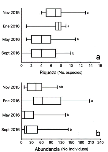 Figura 3: Diagrama de cajas para: a. riqueza y b. abundancia en los cuatro muestreos para los escarabajos coprófagos (Coleoptera: Scarabaeidae) colectados en el jardín botánico de Cartagena, Bolívar, Colombia. Letras diferentes frente a las cajas representan pruebas de contraste post-hoc entre las estaciones evidenciando diferencias significativas (P = 0,05).